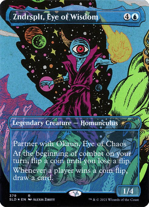 Partner with Okaun, Eye of Chaos (When this creature enters, target player may put Okaun into their hand from their library, then shuffle.) At the beginning of combat on your turn, flip a coin until you lose a flip. Whenever a player wins a coin flip, draw a card.