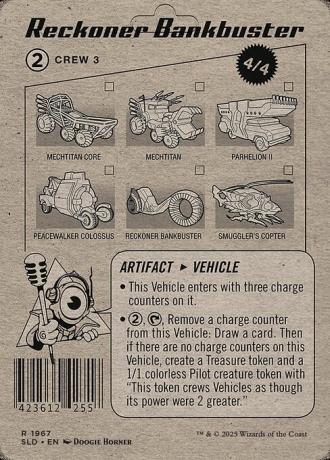 {2}, {T}, Remove a charge counter from this Vehicle: Draw a card. Then if there are no charge counters on this Vehicle, create a Treasure token and a 1/1 colorless Pilot creature token with "This token crews Vehicles as though its power were 2 greater."