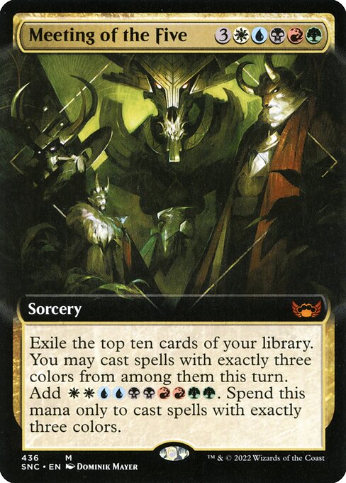 Exile the top ten cards of your library. You may cast spells with exactly three colors from among them this turn. Add {W}{W}{U}{U}{B}{B}{R}{R}{G}{G}. Spend this mana only to cast spells with exactly three colors.