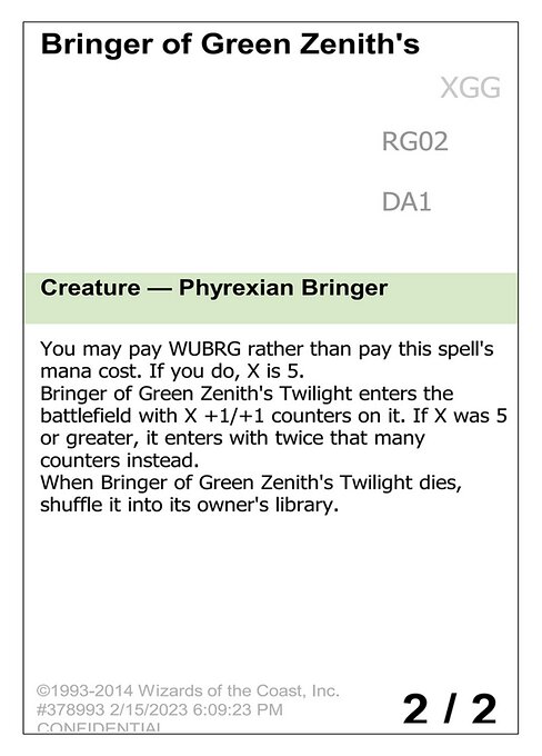 Bringer of Green Zenith's Twilight enters the battlefield with X +1/+1 counters on it. If X was 5 or greater, it enters with twice that many counters instead.