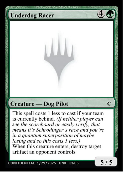 This spell costs {1} less to cast if your team is currently behind. (If neither player can see the scoreboard or easily verify, that means it's Schrödinger's race and you're in a quantum superposition of maybe losing and so this costs {1} less.)