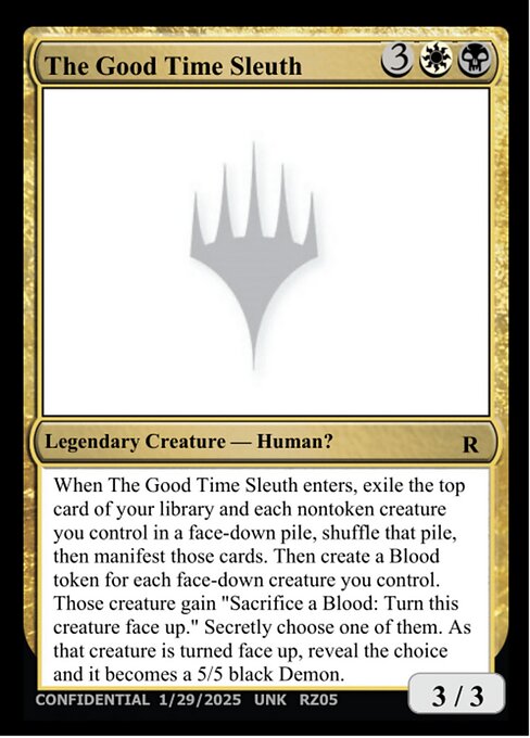 When The Good Time Sleuth enters, exile the top card of your library and each nontoken creature you control in a face-down pile, shuffle that pile, then manifest those cards. Then create a Blood token for each face-down creature you control. Those creature gain "Sacrifice a Blood: Turn this creature face up." Secretly choose one of them. As that creature is turned face up, reveal the choice and it becomes a 5/5 black Demon.