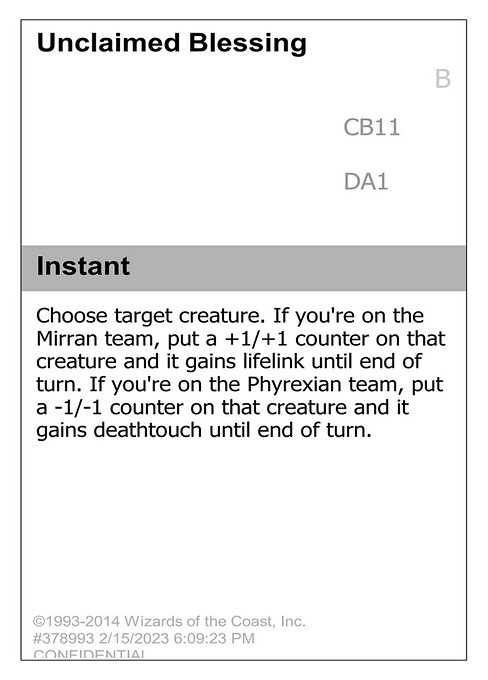 Choose target creature. If you're on the Mirran team, put a +1/+1 counter on that creature and it gains lifelink until end of turn. If you're on the Phyrexian team, put a -1/-1 counter on that creature and it gains deathtouch until end of turn.