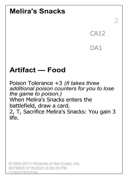{2}, {T}, Sacrifice Melira's Snacks: You gain 3 life.